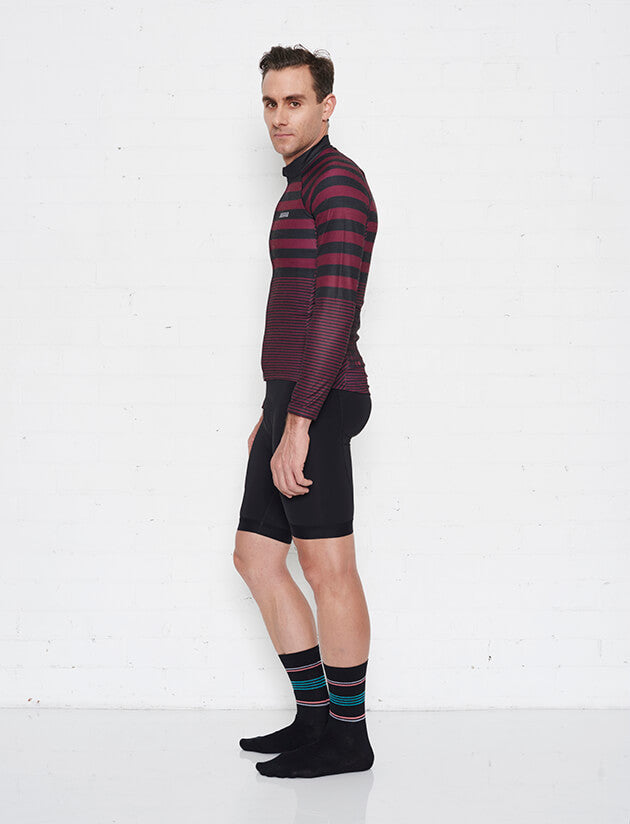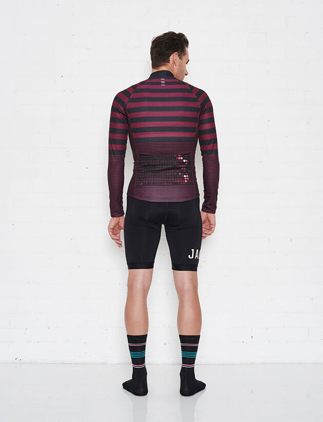 The Little Big Stripe Jersey was designed with Jaggad's classic stripe aesthetic using various widths to contour the body. The back pocket and interior neck uses hexagon shapes to create the feeling of looking at rainy city lights. nJaggad's Long Sleeve jerseys are made with a polyester/wool blend that allows it to be used throughout the year. In colder months, the wool keeps the warmth in and the polyester keeps the cold out. In more moderate months, the wool wicks perspiration away and the polyesters allows it to evaporate quickly.