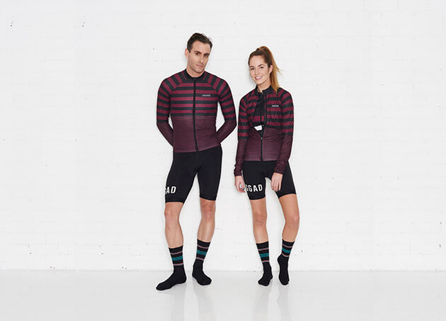 Polyester/ Merino Wool/ Spandex Three spacious back pockets Silicone Gripper Elastic at back hem to keep jersey in place Zip Guard to protect face and neck from abrasion Jaggad Logo at Left Chest Male cyclist wears a size M Female cyclist wears a size XS